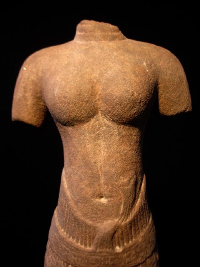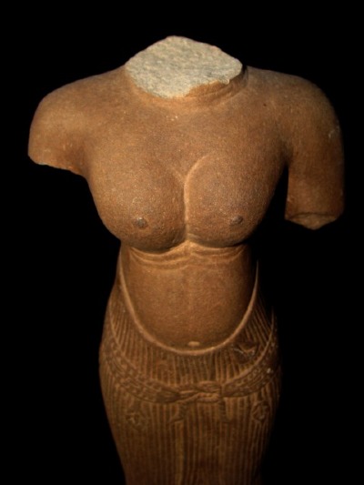 Der folgende weibliche Torso ist aus rötlich-braunem Sandstein gefertigt. Er ist der frühen Angkor-Periode, dem sog. Baphuon-Stil (1010-1113) zuzurechnen. Die Skulpturen des Angkor-Wat-Stils werden stets streng frontal und aufrecht dargestellt.Stiltypisch ist ebenfalls, dass das Hüftgewand (auf Khmer"samput chang kbin") sorgfältig zu einem "Fischschwanz" gefältelt ist,der genau mittig liegt und von einem mit Blütenmotiven verzierten Gürtel gehalten wird.